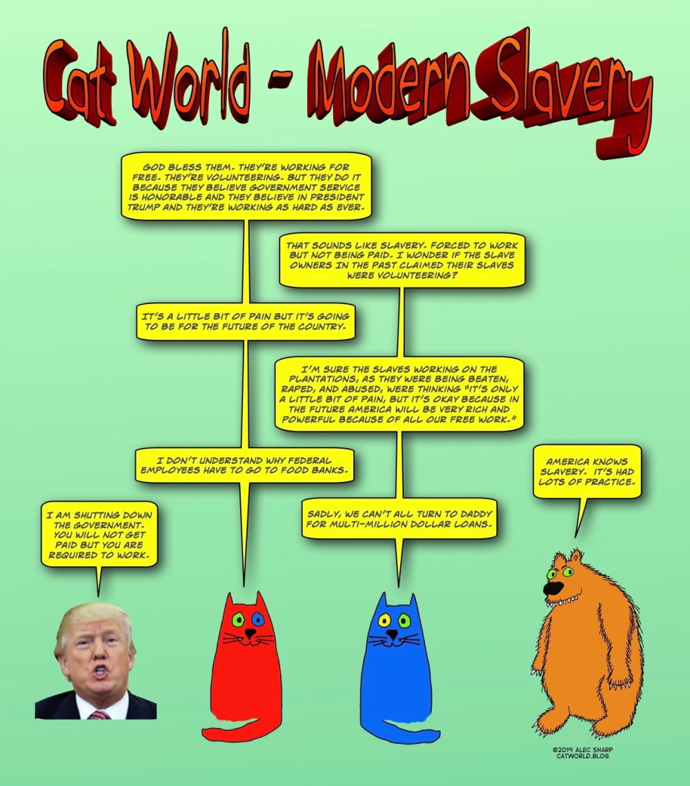 Politics Modern Slavery Posted on January 30, 2019 by Alec in Politics During the recent government shutdown many federal employees were required to work without pay. This was somewhat ironic, and ominous, given America’s dark history of slavery. Share this: Click to share on X (Opens in new window) X Click to share on Facebook (Opens in new window) Facebook Like Loading...