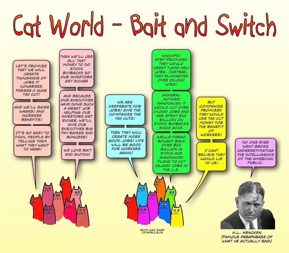 Capitalism, Politics Bait and Switch Posted on July 25, 2019July 10, 2019 by Alec in Capitalism, Politics The recent big tax cuts were a classic case of Bait and Switch. Share this: Click to share on X (Opens in new window) X Click to share on Facebook (Opens in new window) Facebook Like Loading...