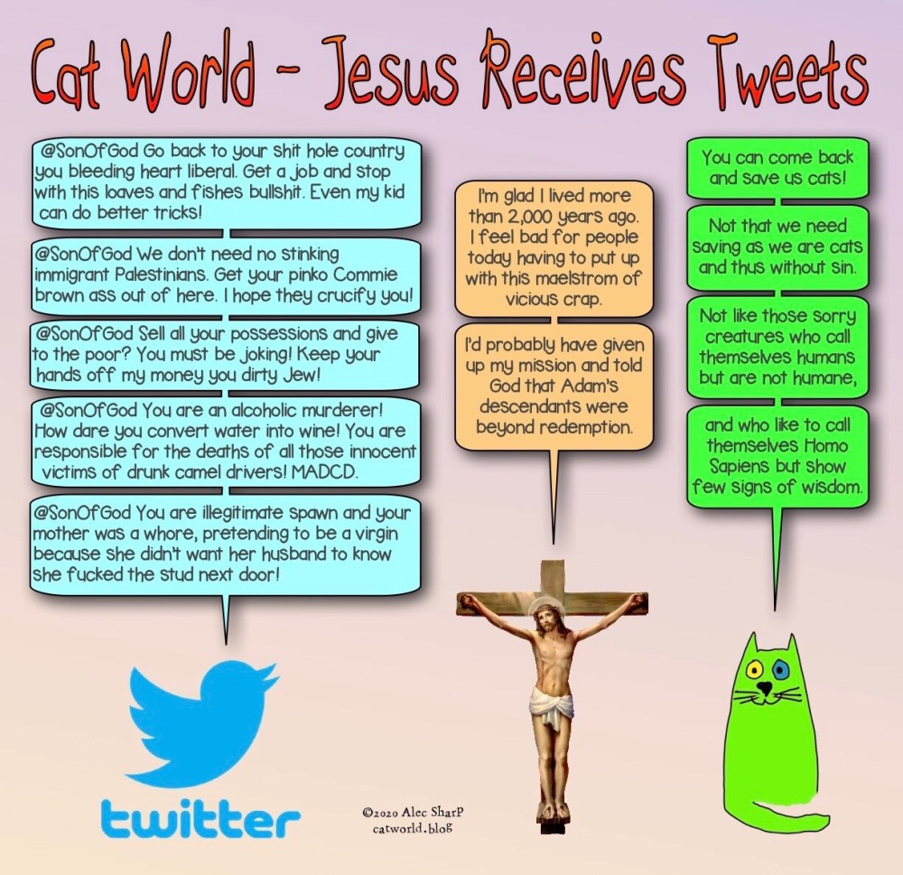 Jesus was lucky to live in a time before Twitter. Imagine how things would be if he had a Twitter account. (As a side note, the Twitter name @SonOfGod was reserved in 2013 by the makers of the movie Son of God, but has never tweeted, so I figure it’s okay if Jesus uses it π)