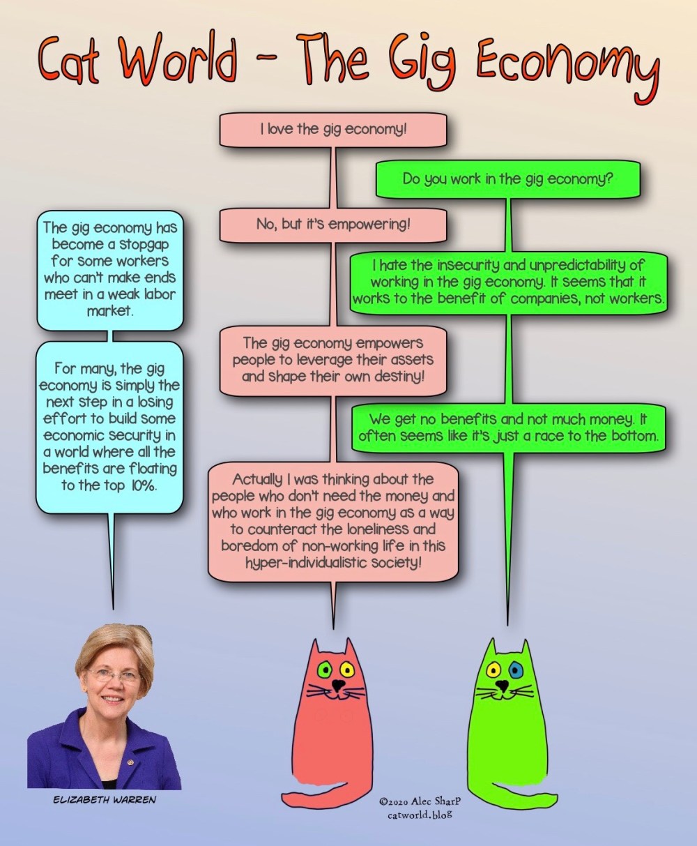 Is the gig economy empowering or just a race to the bottom? Or is it a way for people who don’t need the income to get some social contact in our individualistic society.