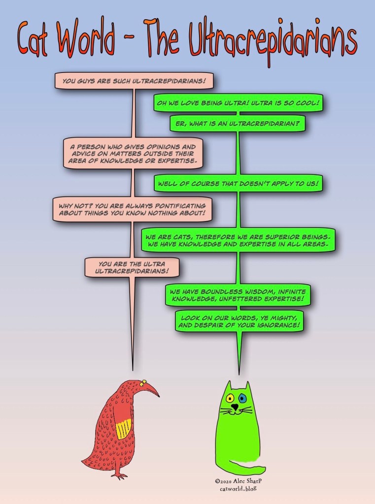 Life The Ultracrepidarians Posted on April 18, 2020April 2, 2020 by Alec in Life Some people might consider the cats to be ultracrepidarians. Do you? Share this: Click to share on X (Opens in new window) X Click to share on Facebook (Opens in new window) Facebook Like Loading...