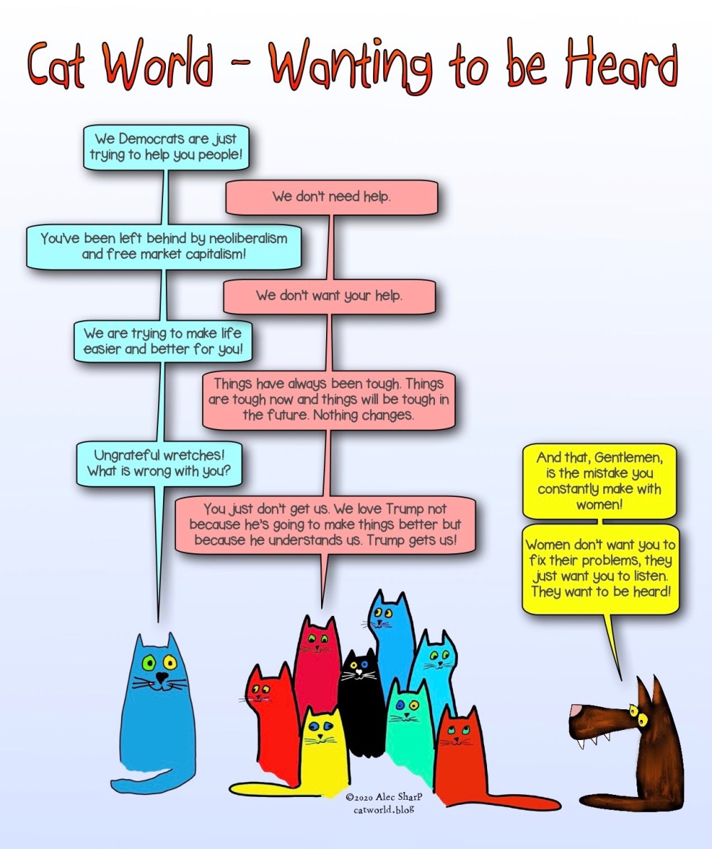 Democrats are all about helping people, but often people don’t want to be helped, they just want to be heard and understood. Like women.