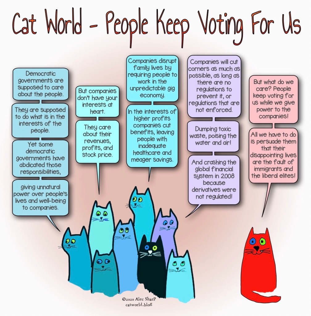 Companies are given more and more power over the lives of people, yet those same people keep voting for politicians who give the power to the companies.