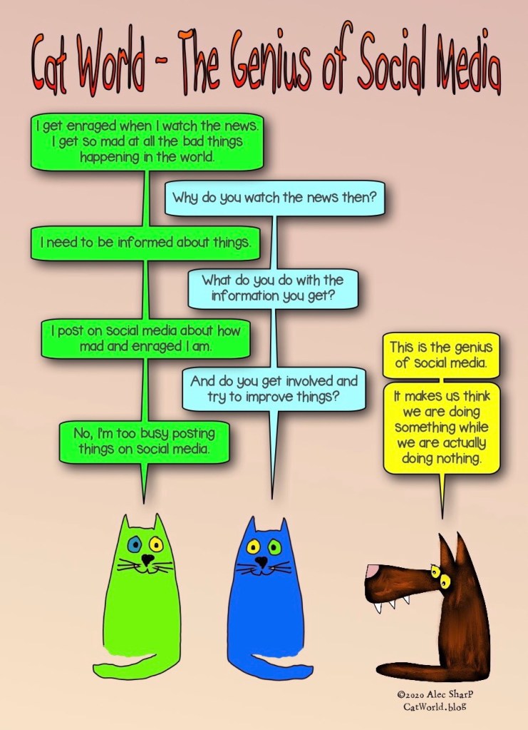 Psychology, Social Media The Genius of Social Media Posted on September 26, 2020September 22, 2020 by Alec in Psychology, Social Media The genius of social media is that when we post something, we feel we are actually doing something. Share this: Click to share on X (Opens in new window) X Click to share on Facebook (Opens in new window) Facebook Like Loading...