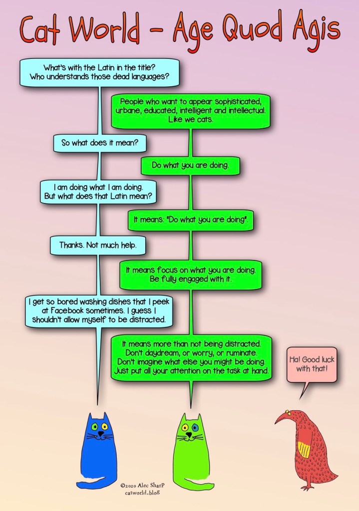 Psychology Age Quod Agis Posted on September 30, 2020September 30, 2020 by Alec in Psychology Focus on the task at hand. Don’t get distracted. In particular, give your full attention to Cat World comics. Share this: Click to share on X (Opens in new window) X Click to share on Facebook (Opens in new window) Facebook Like Loading...