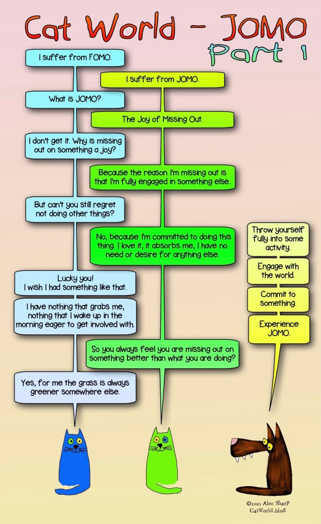 Life, Psychology JOMO – Part 1 Posted on November 12, 2021January 27, 2022 by Alec in Life, Psychology This comic, Part 2, and Part 3, were inspired by the wonderful book Four Thousand Weeks, by Oliver Burkeman. Share this: Click to share on X (Opens in new window) X Click to share on Facebook (Opens in new window) Facebook Like Loading...