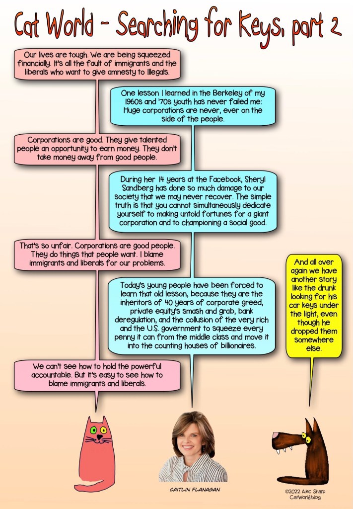 See the previous post if you don’t know what Searching for Keys is referring to. The quotes from Caitlin Flanagan are from her article Sheryl Sandberg and the Crackling Hellfire of Corporate America.