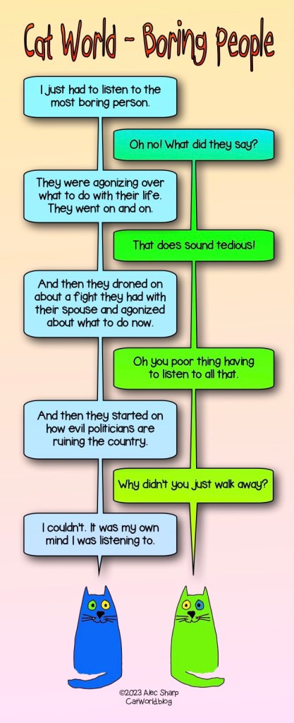 Psychology Boring People Posted on April 8, 2023 by Alec in Psychology It can be so tedious listening to boring people. If you enjoy these comics, please recommend Cat World to your friends. And maybe check out my books. Share this: Click to share on X (Opens in new window) X Click to share on Facebook (Opens in new window) Facebook Like Loading...