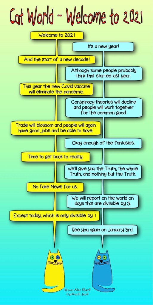As the cats mention, my plan for 2021 is to post a Cat World comic on days that are divisible by 3. Thus on the 3rd, 6th, 9th, etc. Unless I change my mind. And except for today.