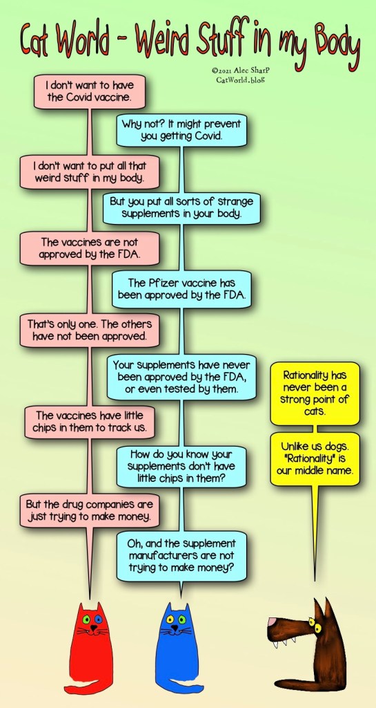 The cats are being deliberately provocative, as cats often are. They know there are many other aspects to the decision of who to vaccinate first: moral, statistical, economic, distribution issues, hospital capability, and more.