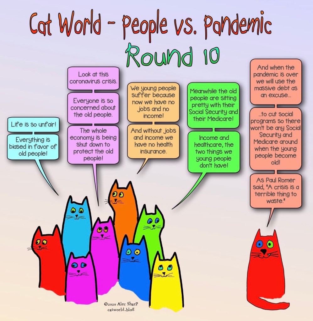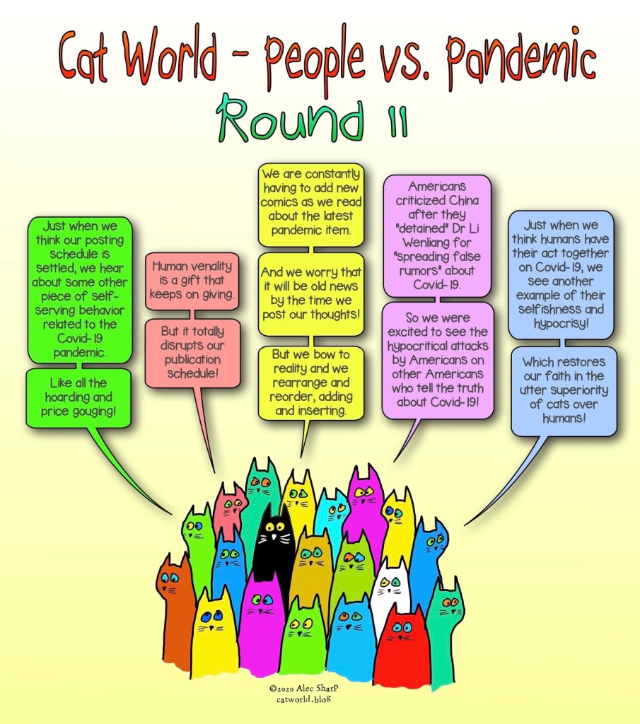 The cats have finally decided to dispense some sensible, thoughtful, caring words of wisdom for these difficult times. And in keeping with their suggestions, they thought they’d share something funny—it’s below the comic.